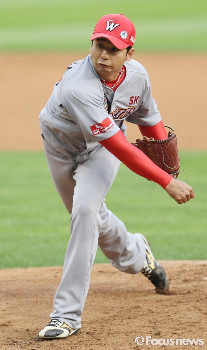 (서울=포커스뉴스) 3일 서울 잠실구장에서 열린 2016프로야구 SK-두산 경기에서 1회말 SK 선발투수 윤희상이 투구하고 있다.
