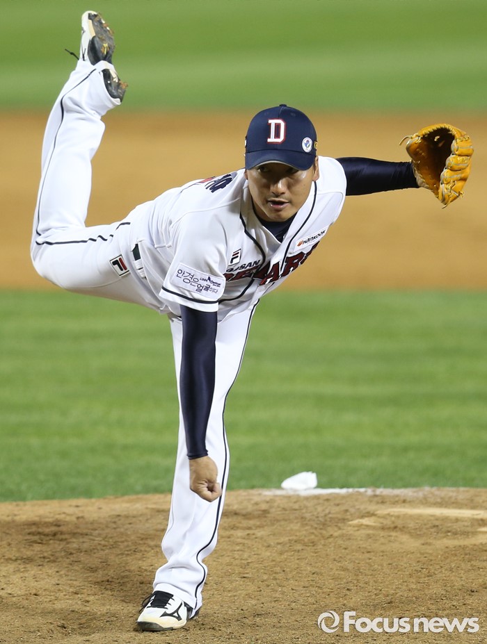 (서울=포커스뉴스) 3일 서울 잠실구장에서 열린 2016프로야구 SK-두산 경기에서 두산 투수 정재훈이 8회 등판해 투구하고 있다.
