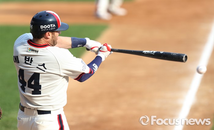 (서울=포커스뉴스) 5일 서울 잠실구장에서 열린 2016프로야구 SK-두산 경기 1회말 1사 1,3루에서 두산 에반스가 좌중간 적시타을 때리고 있다.