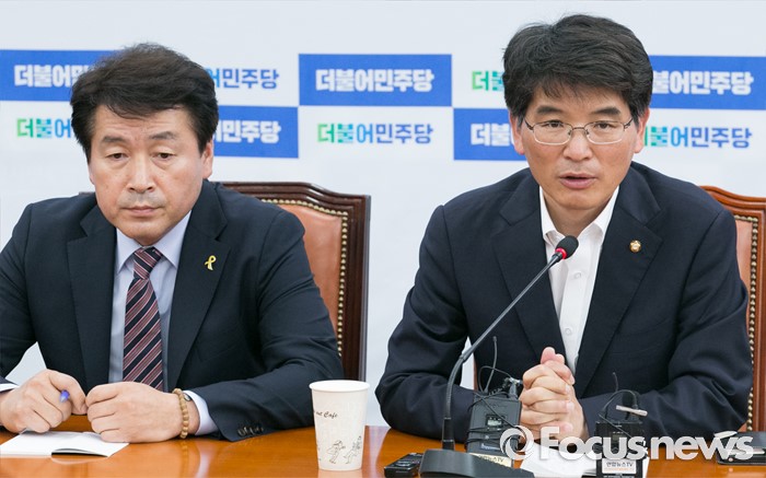 (서울=포커스뉴스) 6일 오전 서울 여의도 국회에서 박완주 더불어민주당 원내수석부대표가 20대 국회 원구성 협상을 위한 3당 원내수석부대표 비공개 오찬을 앞두고 기자간담회를 하고 있다. 왼쪽은 기동민 원내대변인.