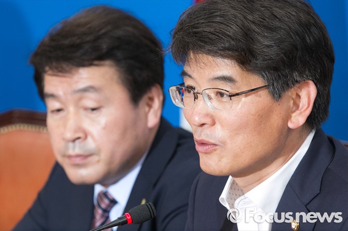 (서울=포커스뉴스) 6일 오전 서울 여의도 국회에서 박완주 더불어민주당 원내수석부대표가 20대 국회 원구성 협상을 위한 3당 원내수석부대표 비공개 오찬을 앞두고 기자간담회를 하고 있다. 왼쪽은 기동민 원내대변인.