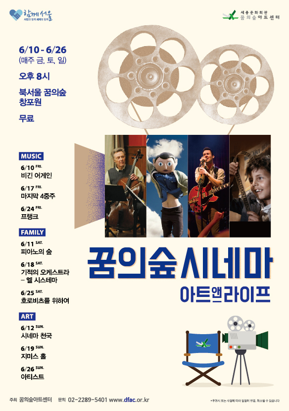 세종문화회관이 운영하는 꿈의숲아트센터는 오는 10일부터 26일까지 매주 금·토·일 오후 8시 북서울꿈의숲에서 야외 영화 상영회 '꿈의숲 시네마'를 개최한다고 밝혔다.