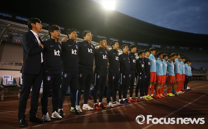 (부천=포커스뉴스) 6일 오후 경기 부천종합운동장에서 열린 2016 4개국 올림픽국가대표 축구대회 대한민국과 덴마크의 경기에서 대한민국 신태용 감독과 코치진들이 애국가를 부르고 있다.
