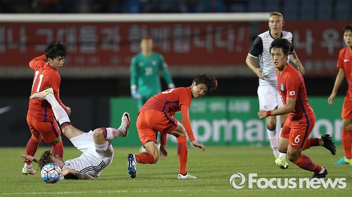 (부천=포커스뉴스) 6일 오후 경기 부천종합운동장에서 열린 2016 4개국 올림픽국가대표 축구대회 대한민국과 덴마크의 경기에서 양팀 선수들이 볼 다툼을 하고 있다.