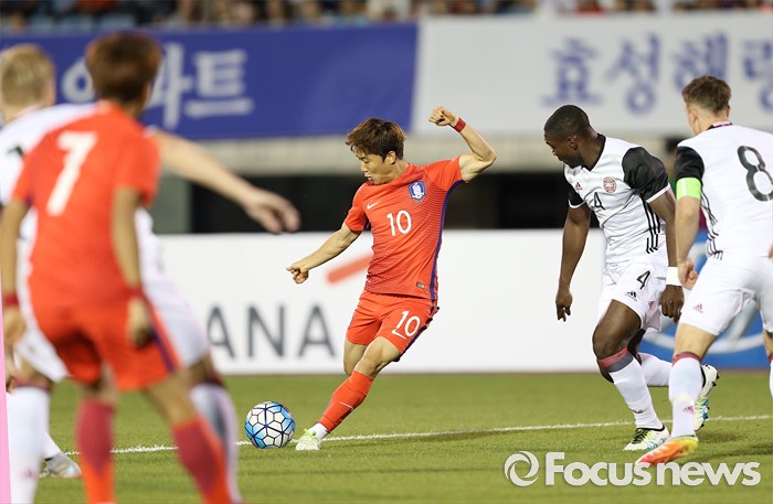 (부천=포커스뉴스) 6일 오후 경기 부천종합운동장에서 열린 2016 4개국 올림픽국가대표 축구대회 대한민국과 덴마크의 경기에서 대한민국 류승우가 패스하고 있다.