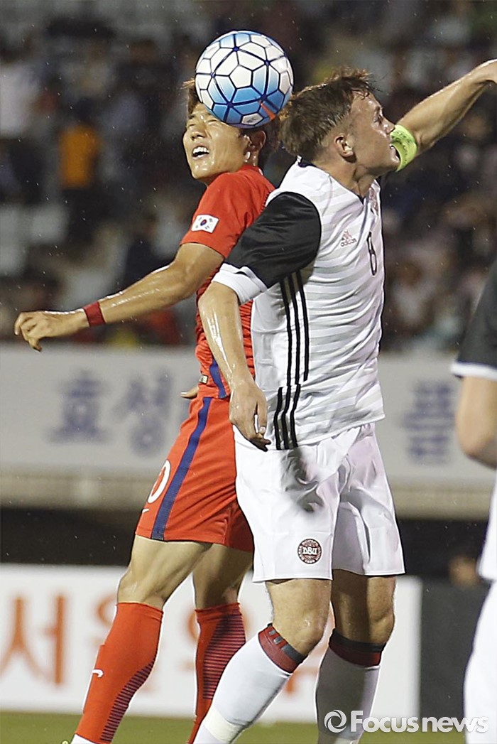 (부천=포커스뉴스) 6일 오후 경기 부천종합운동장에서 열린 2016 4개국 올림픽국가대표 축구대회 대한민국과 덴마크의 경기에서 대한민국 류승우가 상대 선수와 공중 볼 다툼을 하고 있다.
