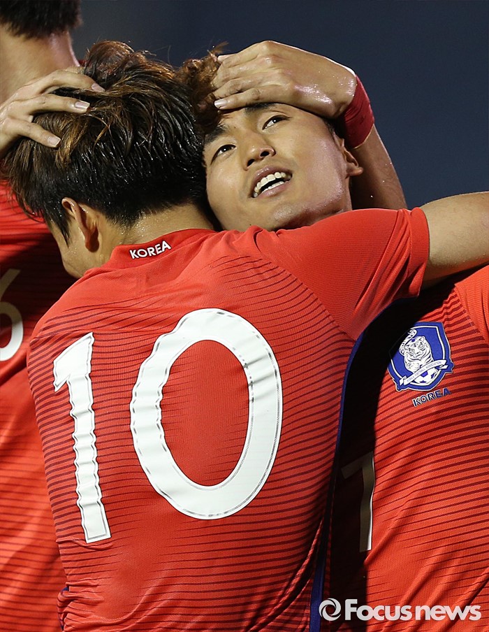 (부천=포커스뉴스) 6일 오후 경기 부천종합운동장에서 열린 2016 4개국 올림픽국가대표 축구대회 대한민국과 덴마크의 경기에서 대한민국 문창진이 선제골을 넣고 선수들과 환호하고 있다.
