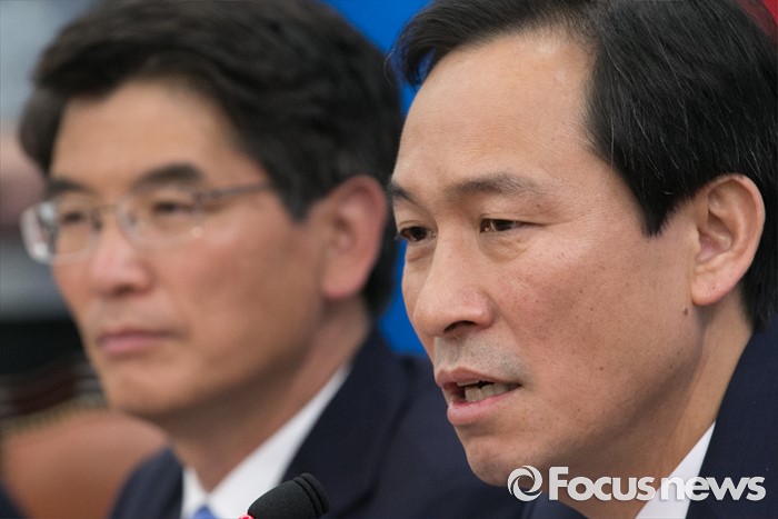 (서울=포커스뉴스) 7일 오전 서울 여의도 국회에서 열린 더불어민주당 원내대책회의에 참석한 우상호 원내대표가 모두발언을 하고 있다.