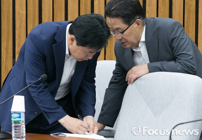 (서울=포커스뉴스) 7일 오전 서울 여의도 국회에서 열린 국민의당 의원총회에 참석한 박지원(오른쪽) 원내대표와 김관영 원내수석부대표가 대화하고 있다.