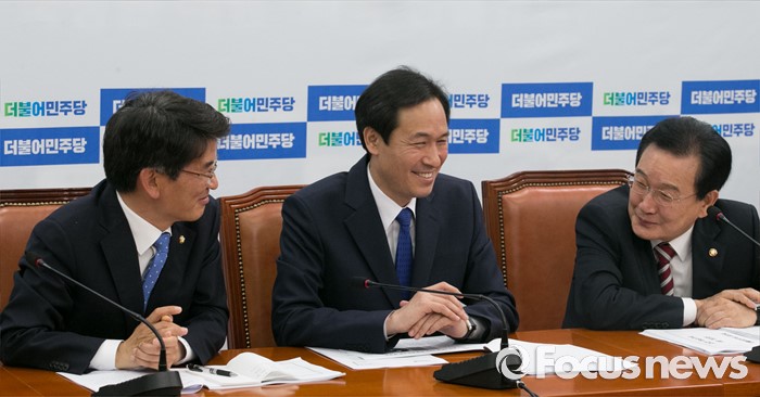 (서울=포커스뉴스) 7일 오전 서울 여의도 국회에서 열린 더불어민주당 원내대책회의에 참석한 우상호(가운데) 원내대표, 변재일(오른쪽) 정책위의장, 박완주 원내수석부대표가 대화하고 있다.