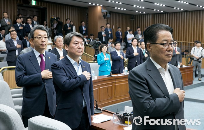 (서울=포커스뉴스) 7일 오전 서울 여의도 국회에서 열린 국민의당 의원총회에 참석한 박지원(오른쪽부터) 원내대표, 안철수 상임공동대표, 김성식 정책위의장 등 의원들이 국기에 대한 경례를 하고 있다.
