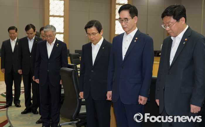 (세종=포커스뉴스) 황교안(오른쪽 세 번째) 국무총리와 국무위원들이 7일 오전 세종시 정부세종청사 국무회의장에서 열린 서울-세종 영상 국무회의에서 순국선열에 대한 묵념을 하고 있다.