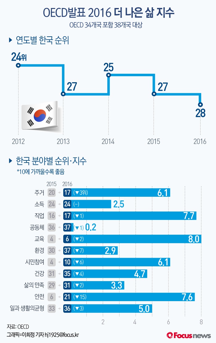 (서울=포커스뉴스) 6일 정부와 연구기관 등에 따르면 최근 경제협력개발기구(OECD)가 공개한 ‘2016 더 나은 삶 지수(Better Life Index·BLI)’에서 한국은 38개 회원국 중 28위를 기록했다. 한국은 환경 부문에서 전년보다 7계단 하락한 37위를, 안전지표는 전년대비 15계단 추락한 21위를 차지했다.