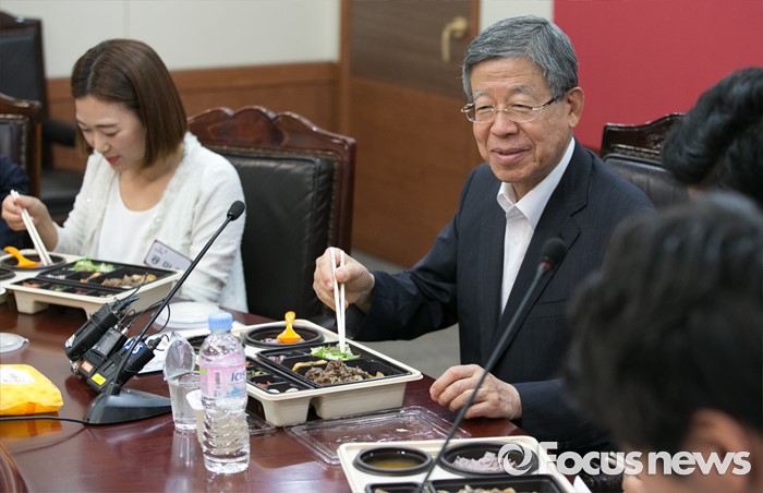 (서울=포커스뉴스) 김희옥 새누리당 혁신비대위원장이 7일 오후 서울 여의도 당사에서 청년 사무처 당직자와의 도시락 간담회를 하고 있다.