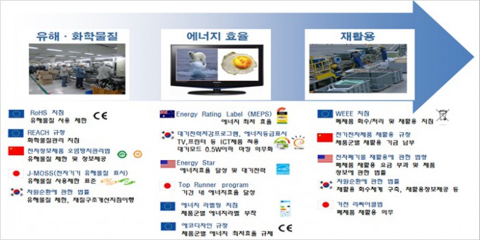 정완용 미래부 정보통신산업정책관은 “유럽을 중심으로 ICT제품에 대한 환경·에너지 규제가 강화되고 있다”며 “미래부는 수출 중소기업들이 해외 규제에 효과적으로 대응할 수 있도록 지속적으로 지원할 계획”이라고 밝혔다.ICT 제품 주기별 환경 규제 내용.<그림제공=미래부>