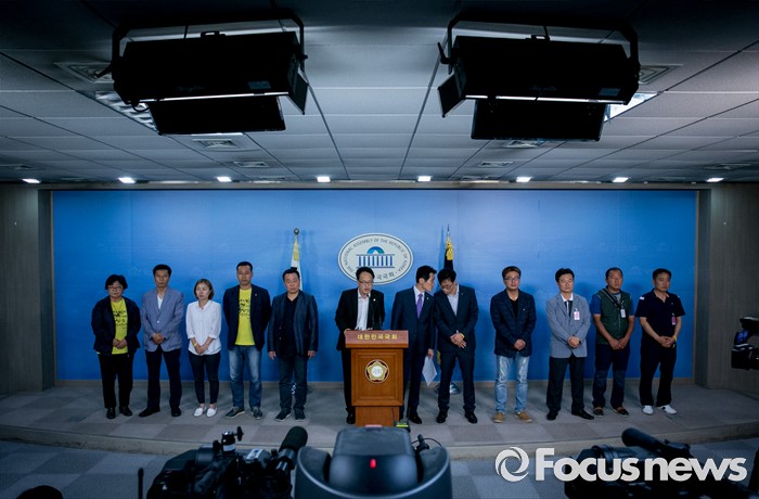 (서울=포커스뉴스) 박주민 더불어민주당 의원과 윤소하 정의당 의원, 전명선 4·16가족협의회 운영위원장, 유경근 집행위원장 등이 7일 오후 서울 여의도 국회 정론관에서 세월호 특별법 개정안 발의 기자회견을 하고 있다.