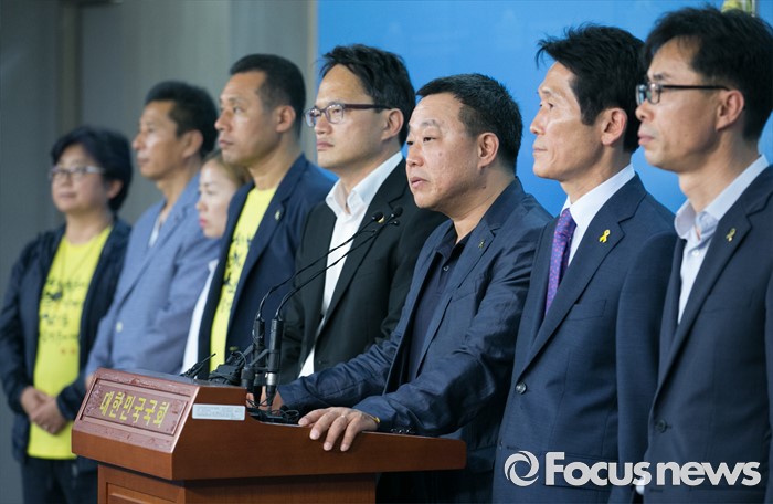 (서울=포커스뉴스) 박주민 더불어민주당 의원과 윤소하 정의당 의원, 전명선 4·16가족협의회 운영위원장, 유경근 집행위원장 등이 7일 오후 서울 여의도 국회 정론관에서 세월호 특별법 개정안 발의 기자회견을 하고 있다.