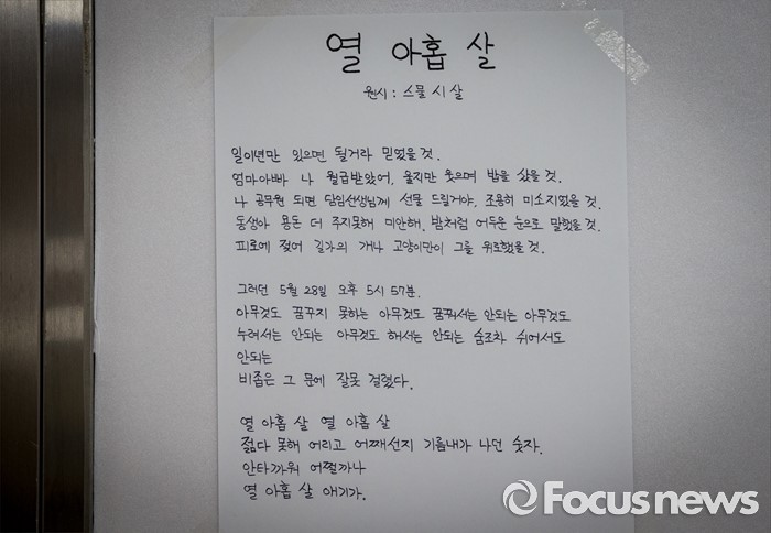 정수영 서울메트로 사장직무대행은 "같은 사고가 재발되지 않도록 하는 것이 유가족에 대한 최선의 사과라고 생각하고 모든 노력을 다하겠다"고 말했다.(서울=포커스뉴스) 31일 오전 서울 광진구 지하철 2호선 구의역에 스크린도어 사고로 희생된 청년을 애도하는 헌시 및 쪽지들이 붙어 있다. 2016.05.31 양지웅 기자