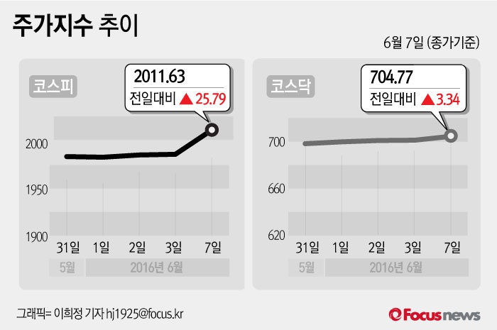 (서울=포커스뉴스) 7일 코스피지수는 전날 보다 1.30%(25.79포인트) 오른 2011.63에 장을 마쳤다. 코스닥지수는 전일 대비 0.48%(3.34포인트) 오른 704.77에 마감했다.