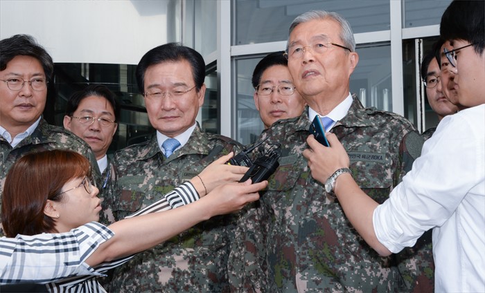 (서울=포커스뉴스) 김종인 더불어민주당 비대위 대표가 8일 오전 서울 용산구 합동참모본부를 방문한 뒤 취재진 질문에 답하고 있다. <사진제공=더불어민주당>