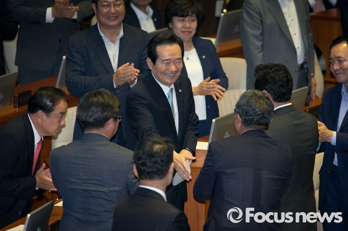 (서울=포커스뉴스) 9일 오후 서울 여의도 국회에서 열린 20대 국회 첫 본회의에서 전반기 국회의장으로 선출된 정세균 더불어민주당 의원이 단상으로 향하며 의원들의 축하를 받고 있다.