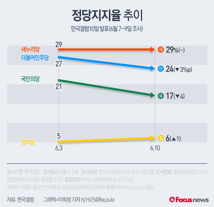 새누리당 지지율은 지난주와 동일했고 더민주당은 3%p, 국민의당은 4%p 하락했다.