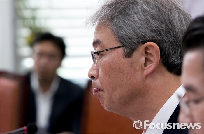 (서울=포커스뉴스) 9일 오전 서울 여의도 국회에서 열린 더불어민주당 가계부채TF, 현황 및 정부대책 보고에 참석한 임종룡 금융위원장이 우상호 원내대표의 발언을 듣고 있다.