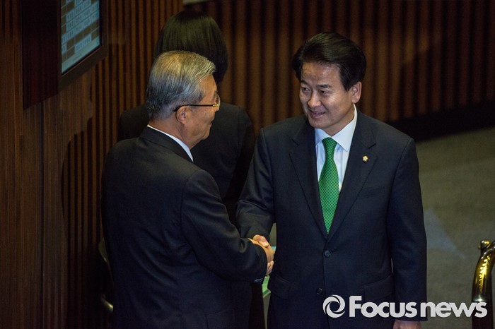 (서울=포커스뉴스) 김종인 더불어민주당 비상대책위 대표와 정동영 국민의당 의원이 9일 오후 서울 여의도 국회에서 열린 본회의에 참석해 인사 하고 있다.