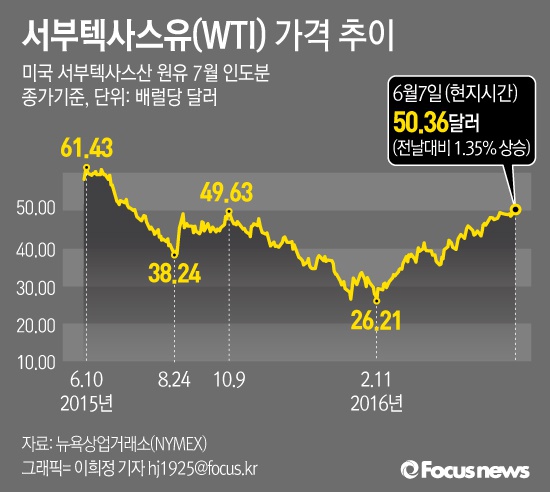 (서울=포커스뉴스) 국제유가가 심리적 저항선인 배럴당 50달러를 돌파하면서 유가 향방에 관심이 쏠리고 있다.