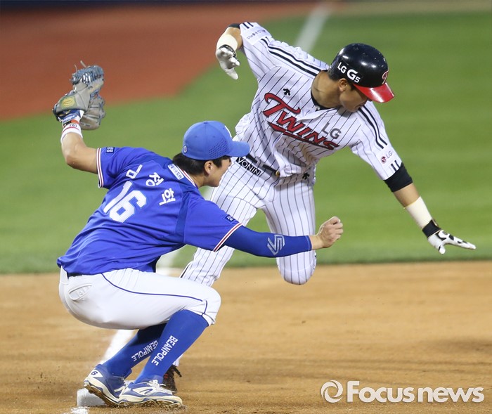 (서울=포커스뉴스) 9일 서울 잠실구장에서 열린 2016 프로야구 삼성-LG 경기 5회말 1사 1,2루에서 더블스틸을 시도한 LG 2루주자 문선재가 3루에서 세이프되고 있다.