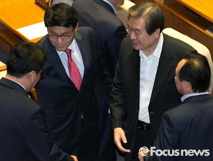 (서울=포커스뉴스) 9일 오후 서울 여의도 국회에서 열린 20대 국회 첫 본회의에 참석한 김무성(오른쪽) 새누리당 전 대표와 윤상현 무소속 의원이 인사하고 있다.