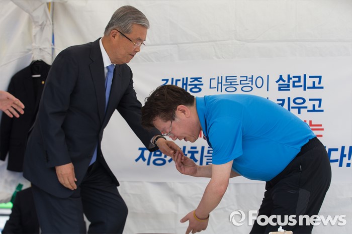 (서울=포커스뉴스) 김종인(왼쪽) 더불어민주당 비상대책위원회 대표가 8일 오후 서울 광화문광장에서 지방재정제도 개편을 반대하며 무기한 단식농성 중인 이재명 성남시장을 만나 자리에 앉고 있다.