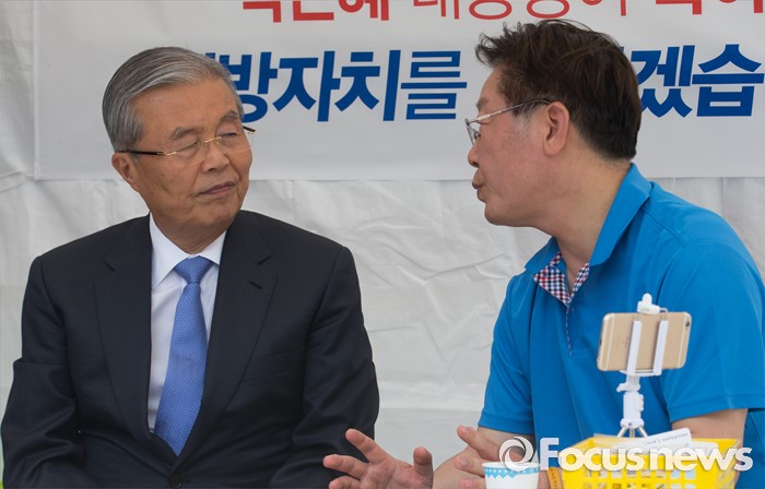 (서울=포커스뉴스) 김종인(왼쪽) 더불어민주당 비상대책위원회 대표가 8일 오후 서울 광화문광장에서 지방재정제도 개편을 반대하며 무기한 단식농성 중인 이재명 성남시장을 만나 대화하고 있다.