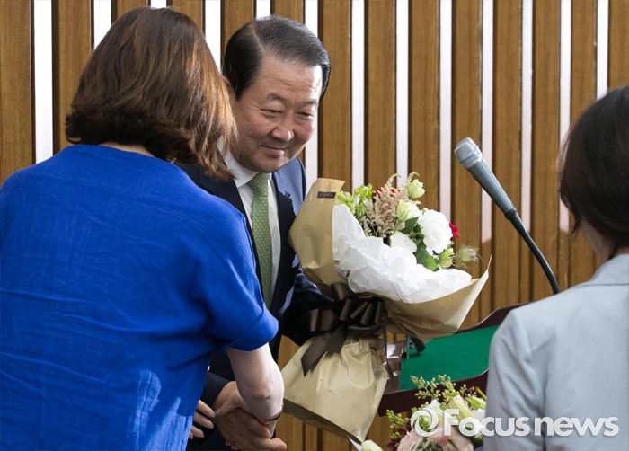 (서울=포커스뉴스) 9일 오전 서울 여의도 국회에서 국회 부의장 후보 선출을 위해 열린 국민의당 의원총회에 참석한 박주선 의원이 축하의 꽃다발을 받고 있다. 이날 국민의당은 국회 부의장 후보로 박주선 의원을 선출했다.