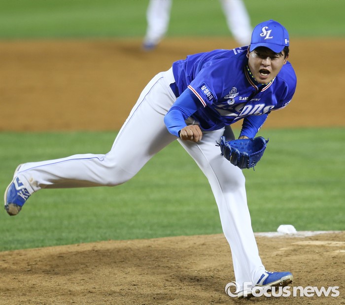 (서울=포커스뉴스) 7일 서울 잠실구장에서 열린 2016 프로야구 삼성-LG 경기에서 9회 등판한 삼성 투수 심창민이 혼신의 힘을 다해 투구하고 있다.