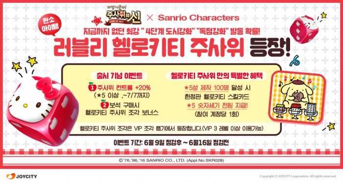 조이시티는 주사위의 신과 산리오의 첫 번째 콜라보레이션을 기념해 전 세계적으로 두터운 팬층을 보유하고 있는 캐릭터 헬로키티를 활용한 신규 주사위를 출시했다.