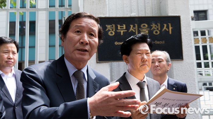 (서울=포커스뉴스) 8일 오전 서울 종로구 정부서울청사 앞에서 정기섭 개성공단기업 비상대책위원회 위원장이 통일부에 방북 신청서 제출 전 기자회견문을 낭독하고 있다.