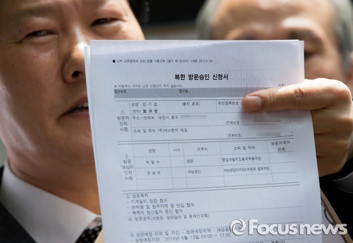 (서울=포커스뉴스) 8일 오전 서울 종로구 정부서울청사 앞에서 개성공단기업 비상대책위원회 관계자들이 통일부에 방북 신청서 제출에 앞서 기자회견을 하고 있다.