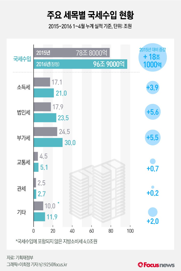 (서울=포커스뉴스) 10일 기획재정부가 공개한 ‘월간 재정동향(6월호)’에 따르면 1~4월 국세수입은 96조9000억원으로 전년동기대비 18조1000억원 증가했다.