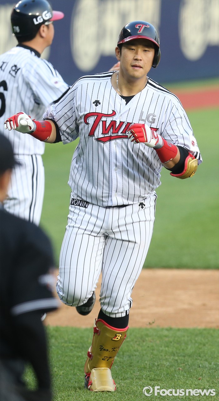 (서울=포커스뉴스) 9일 서울 잠실구장에서 열린 2016 프로야구 삼성-LG 경기 2회말 2사후 LG 유강남이 선제 좌월 솔로 홈런을 치고 홈인하고 있다.