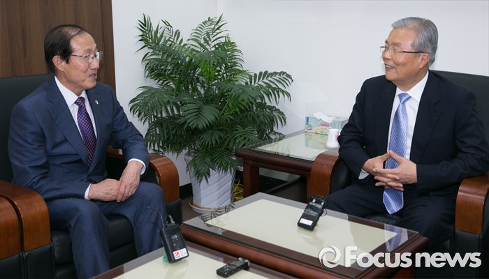 (서울=포커스뉴스) 김종인(오른쪽) 더불어민주당 비대위 대표가 10일 오후 서울 여의도 국회를 방문한 이원종 대통령비서실장과 면담을 하고 있다.