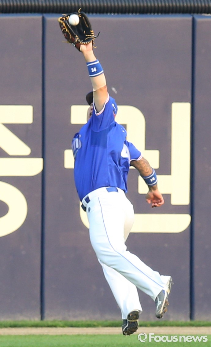 (서울=포커스뉴스) 9일 서울 잠실구장에서 열린 2016 프로야구 삼성-LG 경기 2회말, 삼성 좌익수 최형우가 LG 손주인의 타구를 펜스 앞에서 점프하며 잡고 있다.