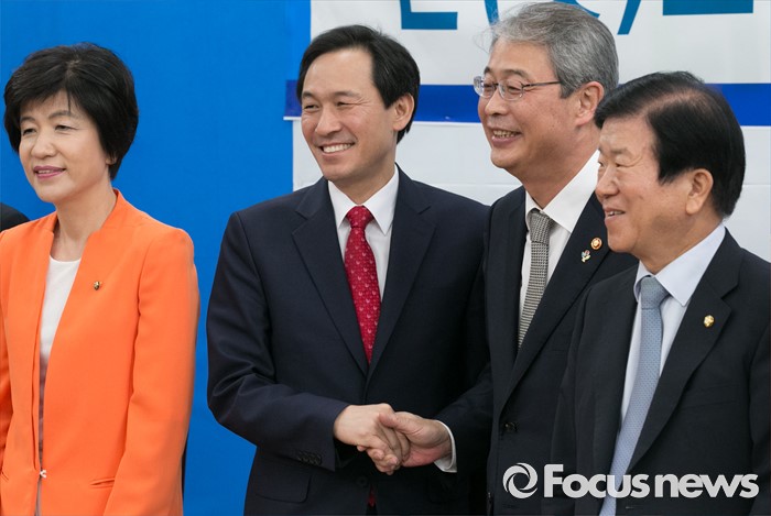 (서울=포커스뉴스) 9일 오전 서울 여의도 국회에서 열린 더불어민주당 가계부채TF, 현황 및 정부대책 보고에 참석한 우상호 원내대표와 임종룡 금융위원장 등 의원들이 포즈를 취하고 있다. 왼쪽부터 김영주 TF 위원장, 우 원내대표, 임 위원장, 박병석 의원.