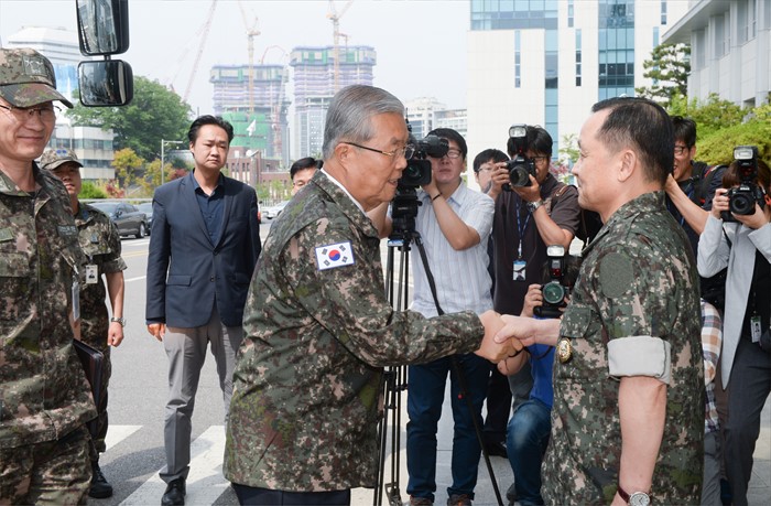 (서울=포커스뉴스) 김종인(왼쪽) 더불어민주당 비대위 대표가 8일 오전 서울 용산구 합동참모본부를 방문해 이순진 합참의장과 인사하고 있다.<사진제공=더불어민주당>