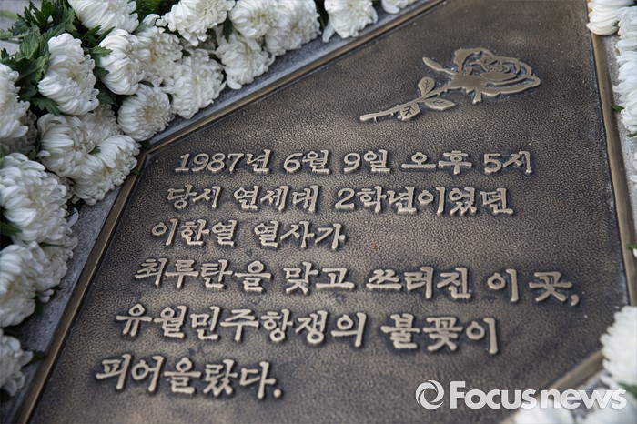 한편 6월 민주항쟁은 지난 1987년 전두환 군사정권의 장기 독재를 저지하기 위해 일어난 범국민적 민주화운동이다. 당시 박종철 고문치사 사건으로 촉발된 민주화 움직임은 같은해 6월 9일 연세대 학생이던 이한열 열사가 경찰이 쏜 최루탄에 맞아 사망하면서 대규모 민주항쟁으로 발전했다.(서울=포커스뉴스) 9일 오후 서울 서대문구 연세대학교 정문 앞에서 열린 '제29주기 이한열 열사 동판 제막식에 참석한 시민들이 고인의 동판에 헌화하고 있다. 2016.06.09 이승배 기자