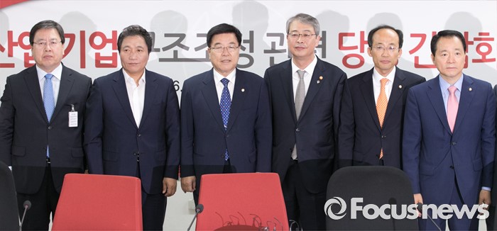 이날 당정 간담회에는 새누리당에서 김광림 정책위의장과 추경호·이학재·정종섭·김영우 의원 등이 참석했으며, 정부 측에선 임종룡 금융위원장, 이관섭 산업통상자원부 제1차관, 윤학배 해양수산부 차관, 이찬우 기획재정부 차관보, 문기섭 고용노동부 고용정책실장, 곽세붕 공정거래위원회 경쟁정책국장 등이 나왔다.9일 오전 서울 여의도 국회에서 열린 산업·기업 구조조정 관련 당정간담회에 앞서 참석자들이 기념촬영을 하고 있다. 왼쪽부터 오정근, 이학재 새누리당 비대위원, 김광림 정책위의장, 임종룡 금융위원장, 추경호, 성일종 의원. 2016.06.09 박동욱 기자 9일 오전 서울 여의도 국회에서 열린 산업·기업 구조조정 관련 당정간담회에 참석한 임종룡(왼쪽) 금융위원장이 모두발언을 하고 있다. 2016.06.09 박동욱 기자
