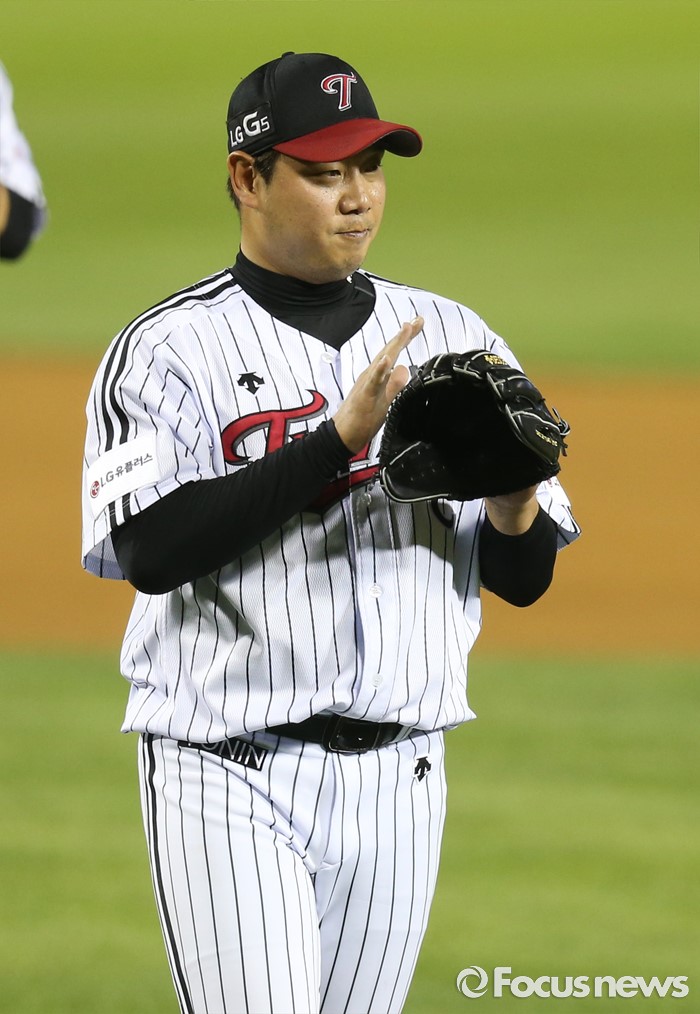 (서울=포커스뉴스) 8일 서울 잠실구장에서 열린 2016 프로야구 삼성-LG 경기 6회 2사후 LG 투수 류제국이 교체돼 마운드를 내려가며 박수를 치고 있다..