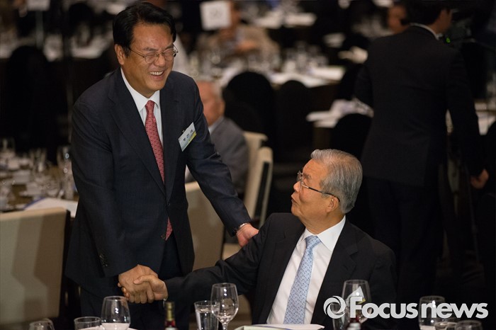 (서울=포커스뉴스) 9일 오후 서울 여의도구 63빌딩 그랜드볼룸에서 열린 '6.15 남북정상회담 16주년 기념식'에 참석한 정진석 새누리당 원내대표(왼쪽)와 김종인 더불어민주당 비상대책위원회 대표가 악수하고 있다.
