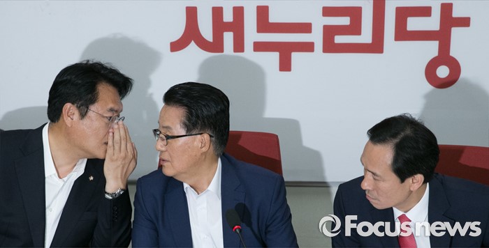 (서울=포커스뉴스) 8일 오후 서울 여의도 국회 새누리당 원내대표실에서 20대 국회 원구성 협상 등을 위한 3당 원내지도부 회동에 참석한 의원들이 논의하고 있다. 이날 여야 3당은 20대 국회 원구성에 합의했다. 왼쪽부터 정진석 새누리당 원내대표, 박지원 국민의당 원내대표, 우상호 더불어민주당 원내대표.