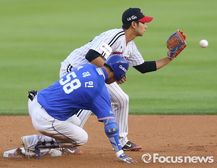 (서울=포커스뉴스) 9일 서울 잠실구장에서 열린 2016 프로야구 삼성-LG 경기 3회초 2사후 삼성 박해민이 우익수 앞에 떨어지는 안타를 치고 2루에서 세이프되고 있다.